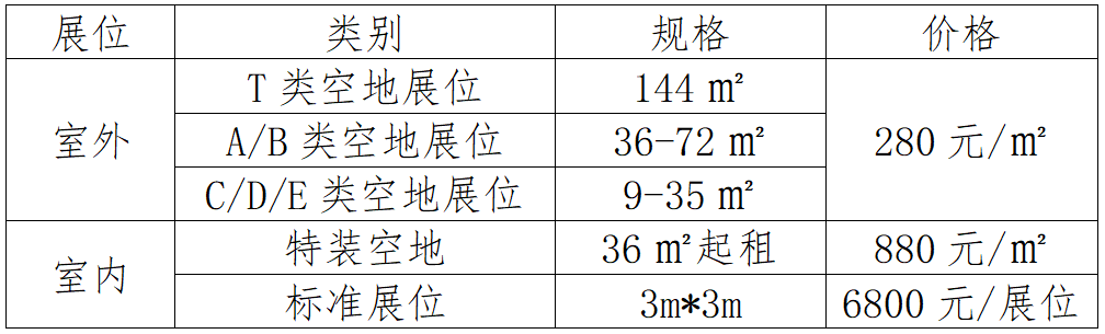 注:1、室外空地展位仅提供桌椅,装修搭建费用企业自理。