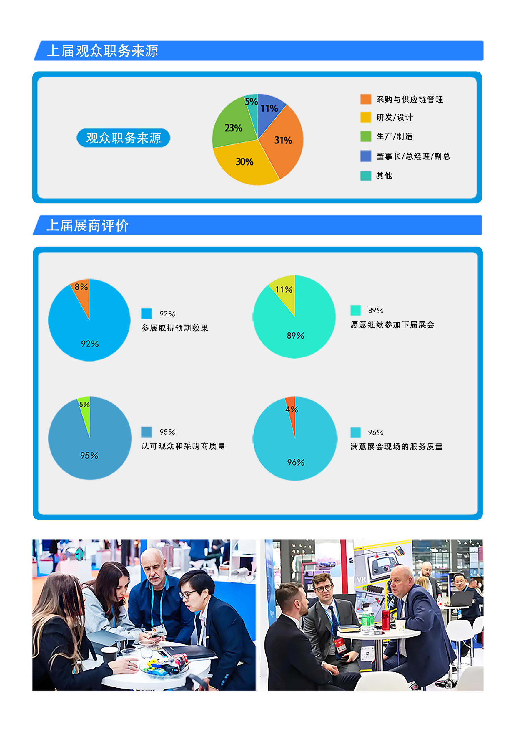 3.观众的职务:70%来自董事长、总经理、副总经理、总工程师、部门经理、采购经理、技术员、设计师、研发人员;其他职务占比30%。